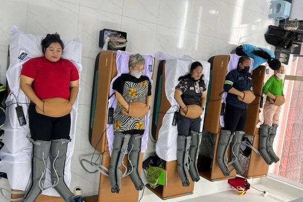 Khách hàng Thái Lan trực tiếp trải nghiệm giường massage JM Selene, cảm nhận công nghệ chăm sóc sức khỏe hiện đại và thư giãn.