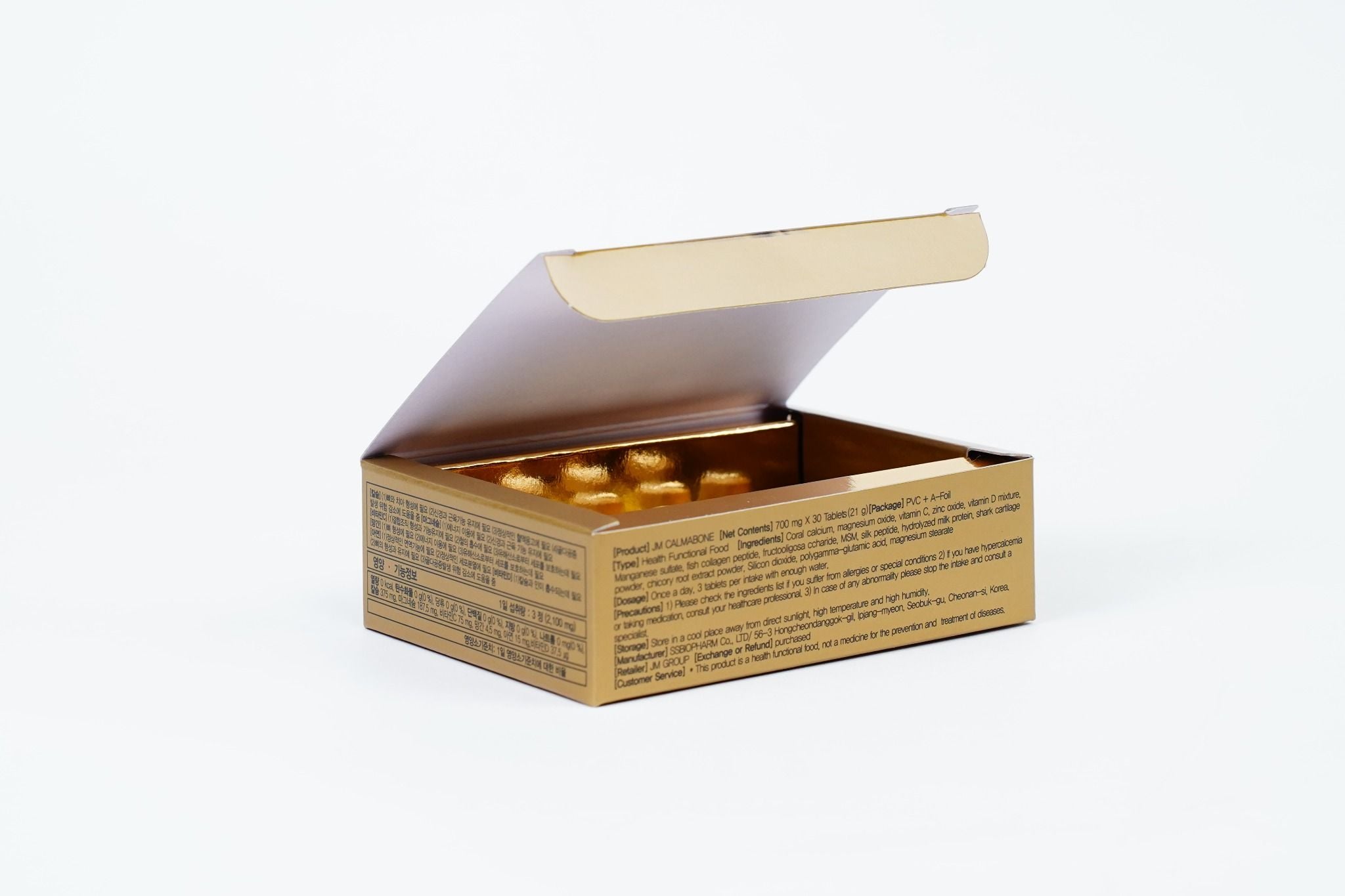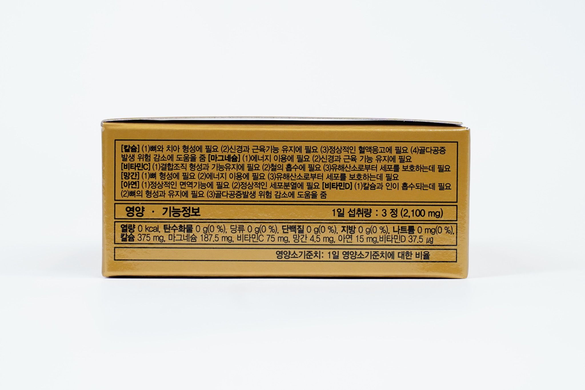 - Thành phần chính (mỗi viên nén chứa): - Canxi san hô (chưa nung), Magie oxit, Vitamin C, Kẽm oxit, Hỗn hợp Vitamin D, Mangan sulfat, Peptide collagen từ cá, Fructooligosaccharide, MSM, Peptide tơ tằm, Protein sữa thủy phân, Bột sụn cá mập, bột chiết xuất rễ rau diếp xoăn, Silicon dioxide, Poly-gamma-glutamic acid, Magie stearat